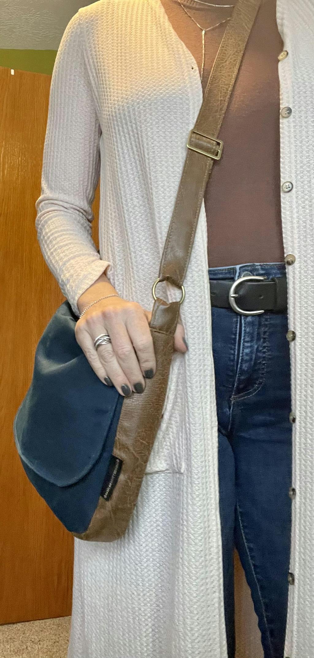 I love the size, the flexibility with the shoulder strap, how slim it is, yet it holds my everyday, and then some. Perfect 2 pockets to keep my phone and my readers close by. And my favorite, cross body - it lays flat and shapes around my hip.